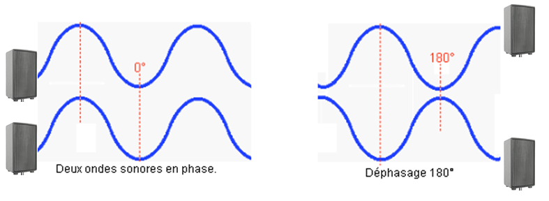 Déphasage : Ce phénomène est identique à celui connu en électronique. Lorsque deux enceinte diffusant vers un même point ne sont pas câblé en phase, on constate en faisant l’addition des deux ondes émises une perte de niveau de pression acoustique.