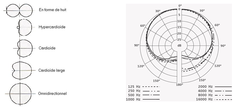 Directivité d’une enceinte ou d’un micro : angle horizontal et vertical, de diffusion du son à partir de l’axe de l’enceinte en fonction de la fréquence. Pour les microphones les directivités les plus employées sont cardioïde, hyper cardioïde ou omnidirectionnelle. Elles sont données par le diagramme polaire :