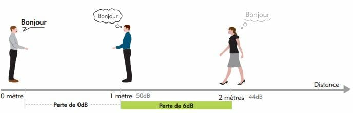 Le niveau de pression acoustique en dB décroit de 6 dB en champ libre lorsque l’on double la distance :