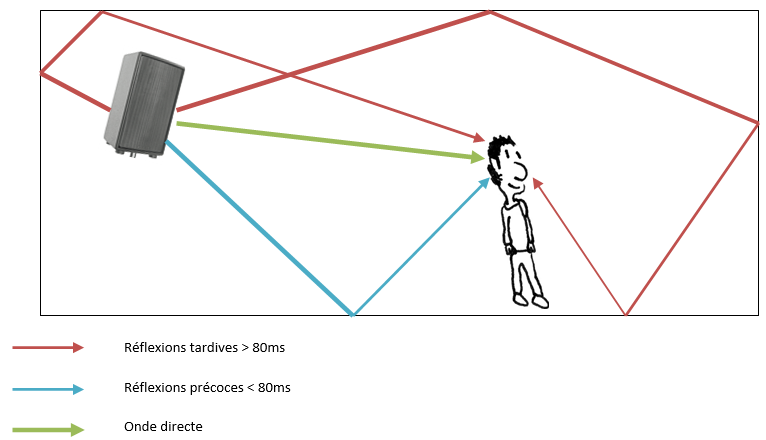 Réflexions : La réflexion est un phénomène qui est du à la rencontre de l’onde sonore contre un obstacle. Il y a deux types de réflexion : les réflexions précoces (importantes pour l’intelligibilité) et les réflexions tardives (nuisibles pour l’intelligibilité).