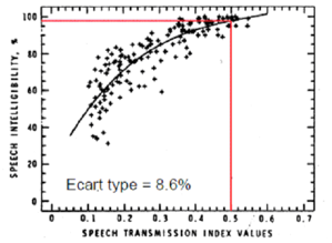 Intelligibilité : pourcentage de compréhension d’un message. Ce pourcentage dépend du rapport entre l’onde directe et l’onde réfléchie et du temps de réverbération. Elle est exprimée en RASTI en STI ou en CIS. Plus le pourcentage est élevé meilleure est l’intelligibilité.